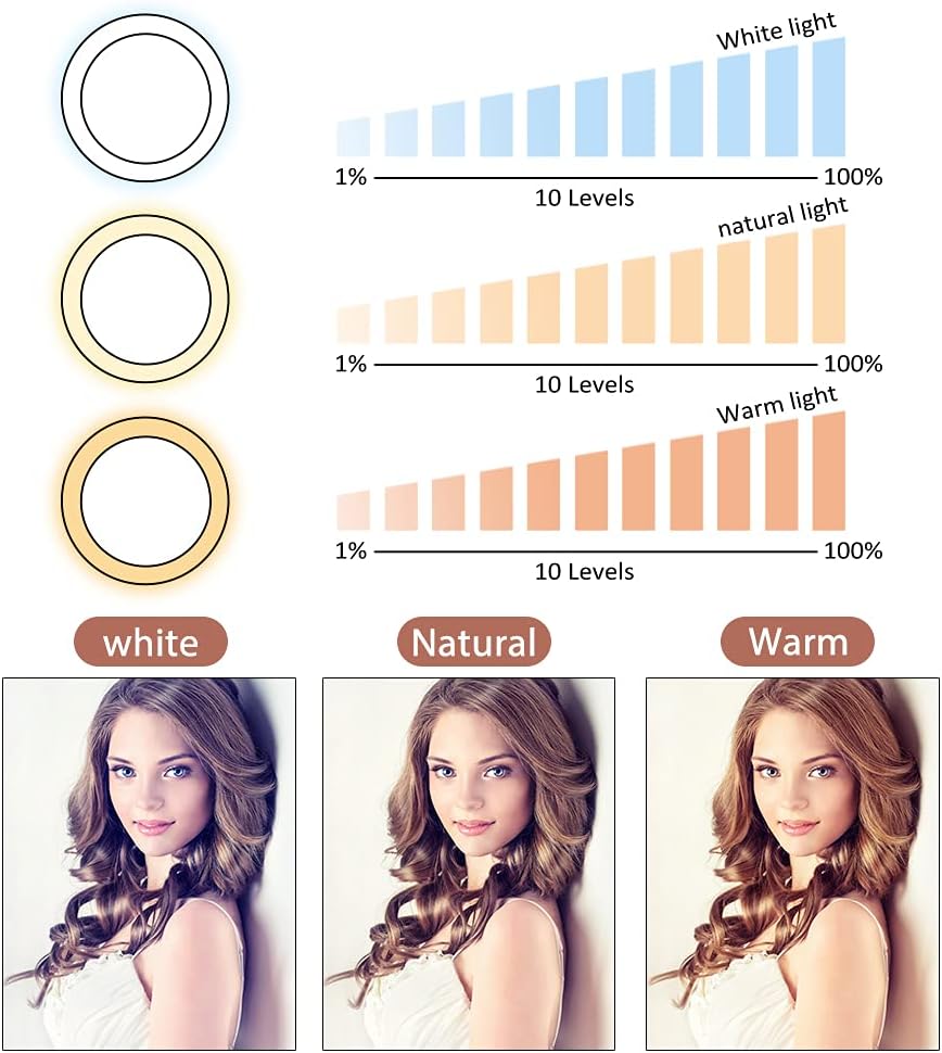 • Dimmable Ring Light Ubeesize 12″ Ring Light Features 3 Light Colors (Warm, Cool White, Daylight) And 10 Levels Brightness In Each Color, 30 Options In Total. You Can Choose Any Option In Between To Find A Perfect Setting