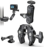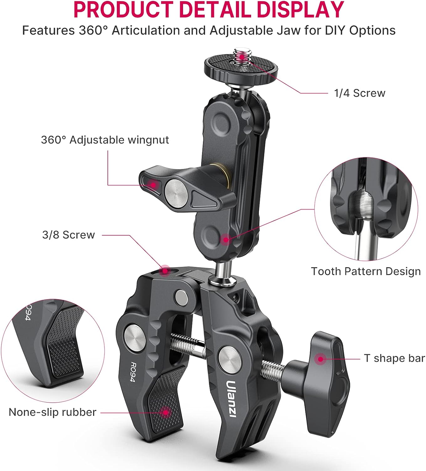 - Standard 1/4” and 3/8” female thread: 1/4” and 3/8” female thread on the back-side of clamp help you to mount a small camera, monitor, LED video light, microphone, speedlite, and more. Come with a gopro adapter, it is also compatible for gopro.