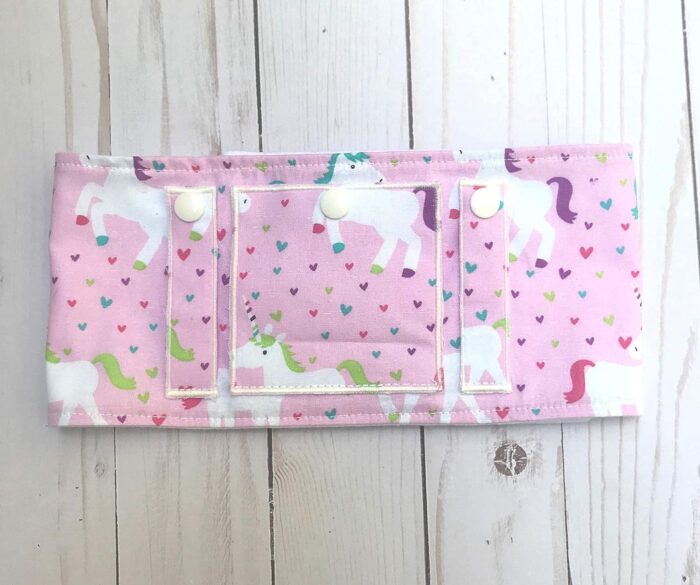 Tired of the constant struggle of trying to protect your child’s button and keeping them from playing with it? These feeding tube protective belts are the answer. Each one is specially made to fit your child’s measurements and are made with a fun cotton print, soft flannel lining and velcro closures that make adjusting the size simple. Each belt has a flap that allows easy access to the button as well a loop on each side of the flap for securing your tubing. All three have snaps to allow for easy opening and closing. Belts all measure 4.5″ high by your chosen length and come with a set of two matching tubie pads. How to order the correct size belt: * Measure around your child’s stomach with a tape measure. Be sure to measure around the area of the button. Choose the length from the drop down box according to your measurement. Do NOT add or subtract inches. I will add length to allow for your child’s growth. * Since this item is custom made for your child, I am unable to accept returns or cancellations. Please make sure to double check your measurement before submitting your order. How to care for your belt: * Hand wash or wash on gentle in cold water. * Lay flat or tumble dry on low heat. *We use VELCRO brand fasteners on all of our g tube belts.