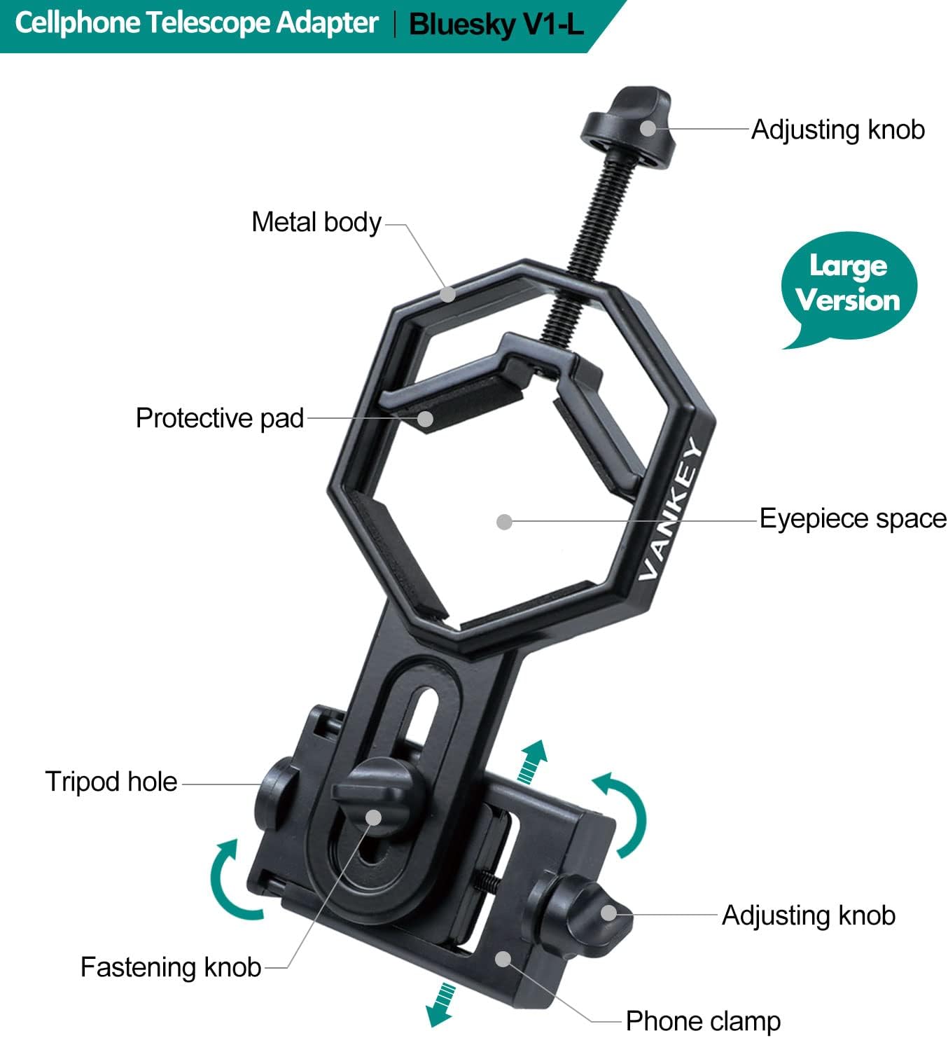 Be the first to review “Vankey Large Telescope Phone Mount, Metal Phone Adapter for Spotting Scope, Monocular, Binocular – Fits iPhone, Samsung and More Smartphone (Bluesky V1-L)” Cancel reply