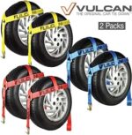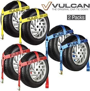 - PROFESSIONAL GRADE TIE DOWNS – Professional truck, trailer, auto hauler, and flatbed operators choose Vulcan auto tiedown systems to haul millions of vehicles every year. Vulcan is recognized as the most qualified, most experienced, vehicle tie down manufacturer in the world. Work with confidence, knowing that these tire harness straps are backed by the 50 years of manufacturing expertise that only Vulcan can provide.