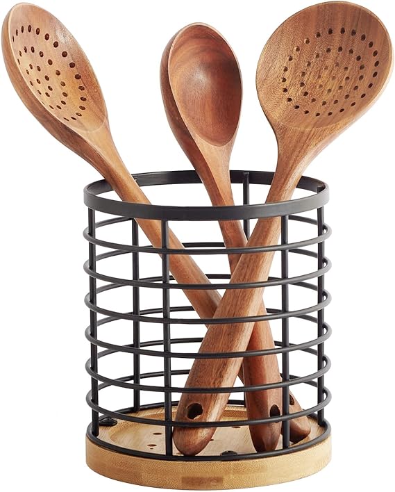 Home Utensil Crocks WDT Tool Utensil holder for Kitchen Counter – 5.2″ x 5.2″ x 6″ Large Round with Wooden Base Matte Black Cooking Utensil Holder Utensil Organizer (Metal+Bamboo)