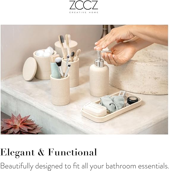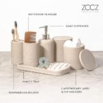ZCCZ – Beige Bathroom Accessories Set 6 Pcs – Toothbrush Holder, Lotion Soap Dispenser, 2 Qtip Holder Dispensers, Vanity Tray, Bathroom Tumbler – Countertop Vanity Organizer – Bathroom Accessory Set